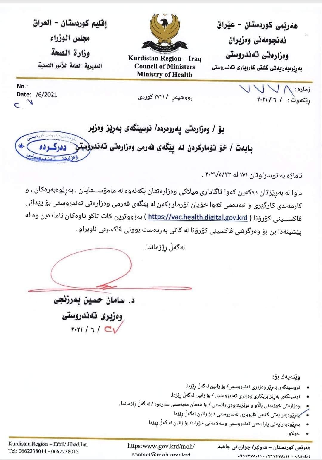 ژپێخەمەت سلامەتیا مامۆستایێن خۆشتڤی و بەردەوامیدان ب پڕۆسا پەروەردە و فێرکرنێ. وەزارەتا ساخلەمیێ ڕێژەیەکا پێشینە دێ دەتە مامۆستایان بۆ وەرگرتنا ڤاکسینێ ب هەماهەنگیا وەزارەتا پەروەردێ یا حکومەتا هەرێما کوردستانێ داخوازێ ژ مامۆستایان دکەت خوە تۆمار بکەن دسیستەمێ ئۆنڵاین و پۆڕتاڵی KURDVAC بۆ وەرگرتنا ڤاکسینێ